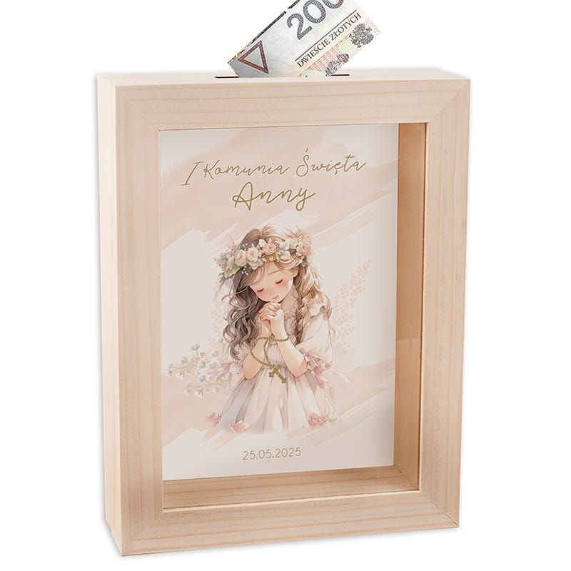 Produkt został wykonany z jasnego, naturalnego drewna, które doskonale wpisuje się w estetykę komunijną. Centralną część skarbonki zdobi ilustracja dziewczynki ubranej w białą sukienkę z różańcem w dłoniach. Jej głowę zdobi wianek z pastelowych kwiatów. Skarbonka posiada przezroczysty front, za którym umieszczona jest personalizowana grafika. W górnej części znajduje się szczelina na banknoty i monety. Całość została starannie wykończona, a projekt graficzny utrzymany jest w jasnych, kremowych i pudrowych barwach. Dzięki temu produkt pasuje do dziecięcych wnętrz i może pełnić funkcję dekoracyjną.