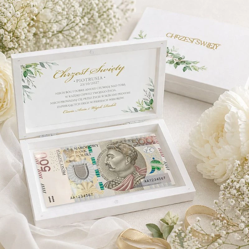 Solidna konstrukcja oraz zamykana forma sprawiają, że pudełko nie tylko estetycznie prezentuje zawartość, ale również chroni ją i może być przechowywane przez długie lata jako pamiątka. To praktyczne rozwiązanie, które pozwala wręczyć pieniądze w bardziej przemyślany i elegancki sposób niż tradycyjna koperta. Idealny prezent na Chrzest Święty dla chłopca lub dziewczynki.