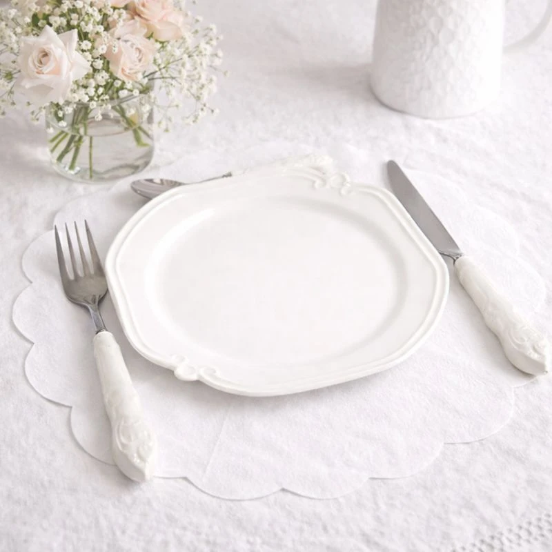 Serwetki wykonane są z wysokiej jakości papieru i wyróżniają się subtelnym tłoczeniem, które nadaje im delikatnej struktury i eleganckiego wyglądu. Okrągły kształt sprawia, że można wykorzystać je na wiele sposobów- jako klasyczne serwetki, podkładki pod talerze lub dekoracyjny element stołu. Neutralna, biała kolorystyka pozwala łatwo dopasować je do każdej aranżacji - od minimalistycznej po bardziej dekoracyjną.