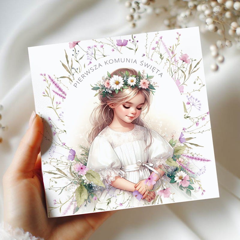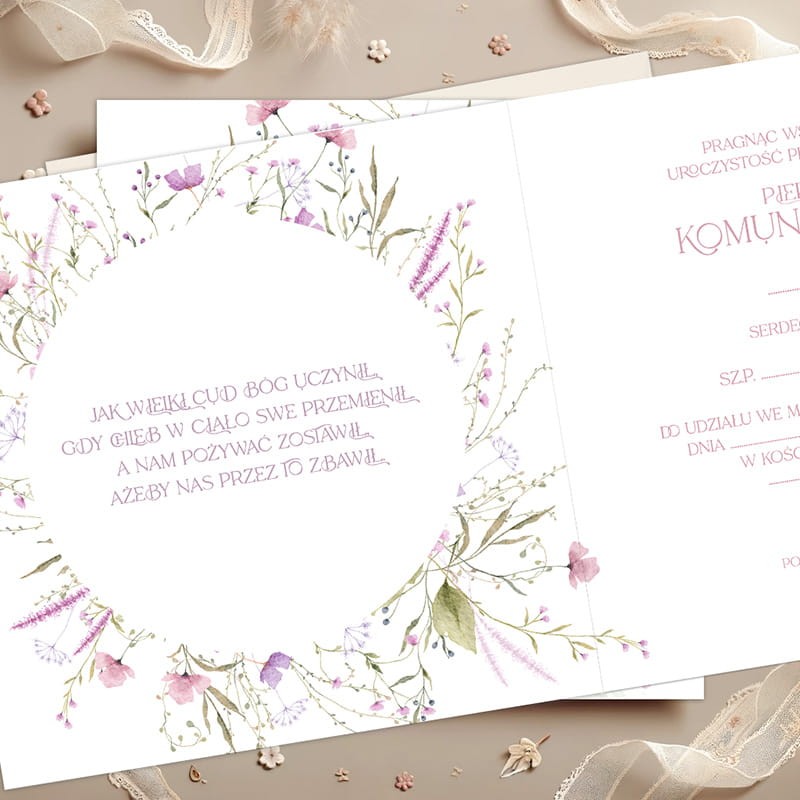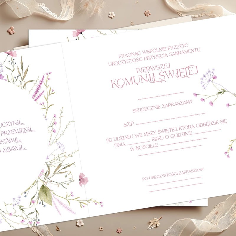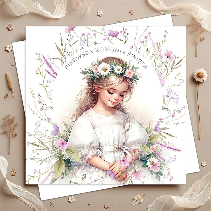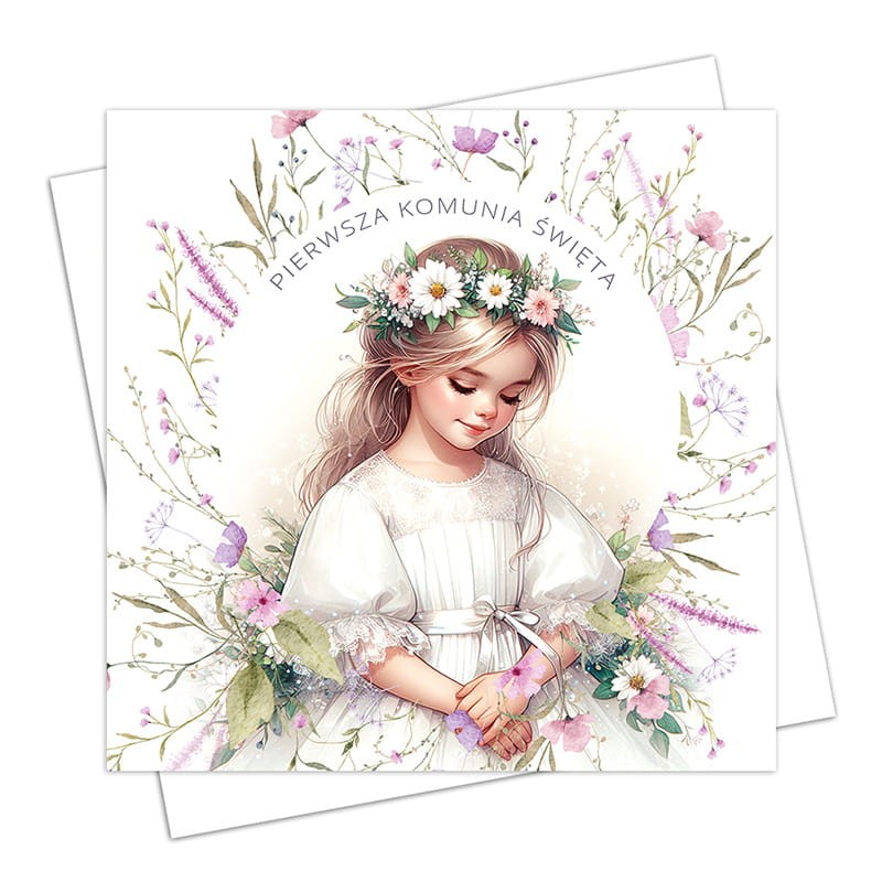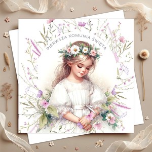 Na froncie zaproszenia znajduje się ilustracja dziewczynki w białej sukience komunijnej, ozdobionej wiankiem z kwiatów w pastelowych odcieniach. Całość otoczona jest lekką, kwiatową kompozycją w tonacjach różu, fioletu i zieleni, która nadaje projektowi romantycznego i dziewczęcego charakteru. Nad grafiką widnieje napis „Pierwsza Komunia Święta” w eleganckiej czcionce. Zaproszenia są do samodzielnego wypisania, dzięki czemu można je w pełni dopasować do własnych potrzeb.