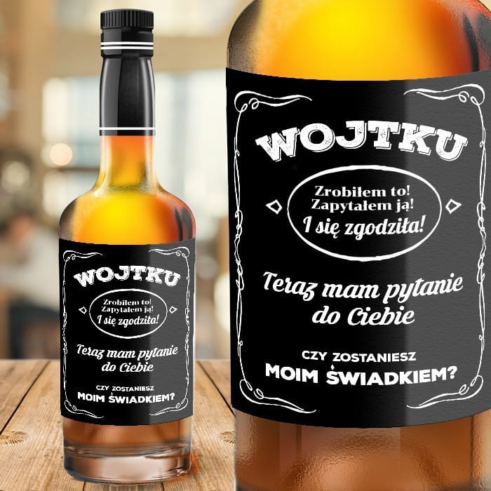 - Etykieta personalizowana na butelkę alkoholu to wspaniała propozycja prośby o świadkowanie. Na etykiecie umieścimy grafikę, która nadaje męskiego charakteru. Butelka z alkoholem z pewnością będzie pomysłowym upominkiem dla przyszłego świadka.