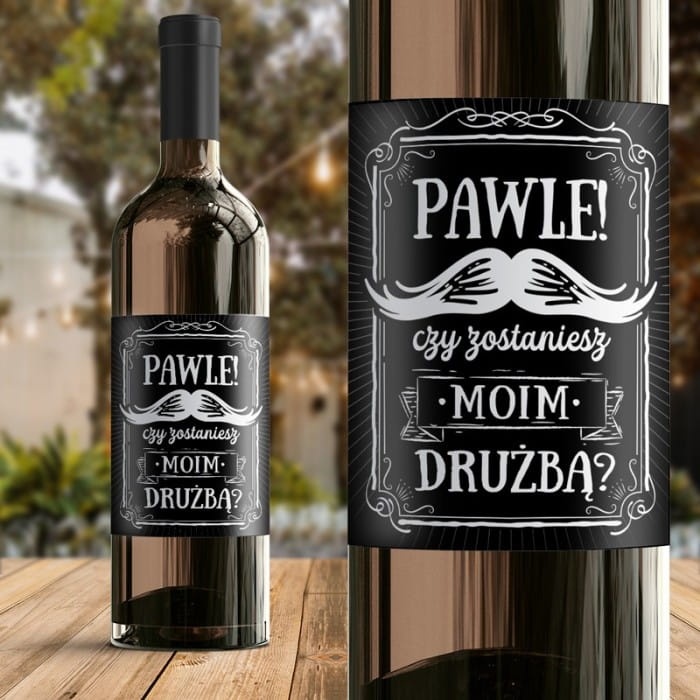Etykieta na wino z pytaniem do drużby jest wykonana na eleganckim samoprzylepnym papierze. Ma prostokątny kształt i efektowny design. Na etykiecie na czarnym tle znajdzie się pytanie: „Czy zostaniesz moim drużbą”? Będzie poprzedzone imieniem przyjaciela, kolegi z pracy czy członka rodziny, którego chcesz poprosić o pełnienie tej zaszczytnej funkcji. Będzie to bezpośredni zwrot do potencjalnego drużby zakończony wykrzyknikiem. Na etykiecie widoczna będzie jeszcze biała grafika wąsów. Treść będzie zamknięta w białej ornamentowej ramce. Design etykiety na wino dla drużby przypomina planszę widywaną na starych czarno-białych niemych filmach.
