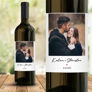 Etykieta wykonana jest z wysokiej jakości papieru samoprzylepnego, który łatwo dopasowuje się do większości klasycznych butelek wina. Na białym tle znajduje się kwadratowe pole ze zdjęciem wybranym przez klienta, które stanowi główną część projektu. Pod fotografią nadrukowane są imiona pary a poniżej pojawia się niewielkie serduszko oraz indywidualna data, np. początek związku, dzień ślubu lub inna istotna chwila.