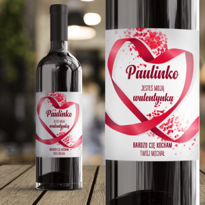 - Personalizowana etykietka na wino jest samoprzylepna i ozdobi dowolną butelkę z białym, czerwonym lub różowym winem, a nawet szampanem. Na białym tle znajdzie się zwrot do ukochanej, czyli jej odmienione imię. W dalszej kolejności zapiszemy zdanie: Jesteś moją Walentynką. To wyznanie znajdzie się w sercu stworzonym z czerwonej wstęgi. Na etykiecie widać będzie jeszcze drobne konfetti w kształcie serduszek. U dołu etykiety widnieć będzie wyznanie: Bardzo Cię kocham Twój... W wykropkowanym polu znajdzie się oczywiście Twoje imię. Personalizowana etykietka na wino może być jednym ze sposobów wyznania miłości albo ponownego potwierdzenia swoich uczuć.