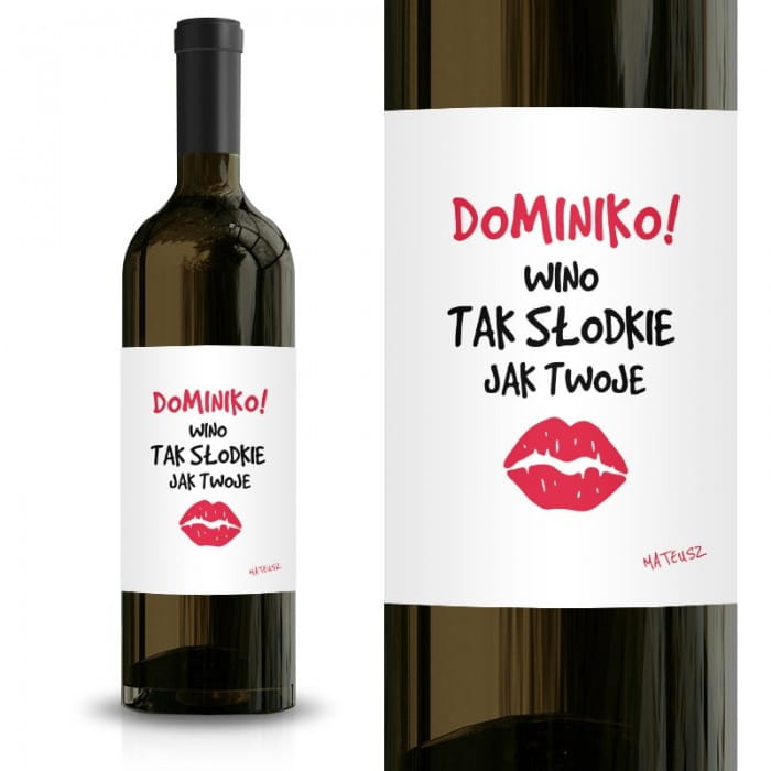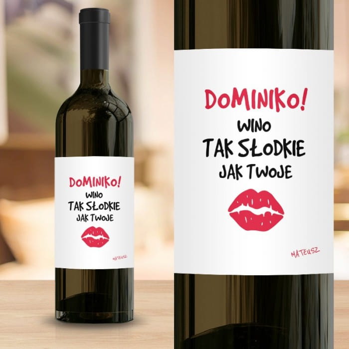 Biała etykieta z napisem "Wino słodkie jak Twoje usta" i grafiką czerwonego całusa dodaje butelce niepowtarzalnego akcentu. Personalizacja imienia i podpisu sprawia, że prezent staje się jeszcze bardziej osobisty. Dzięki tej etykiecie każda butelka stanie się pięknym przejawem miłości i troski o drugą osobę.