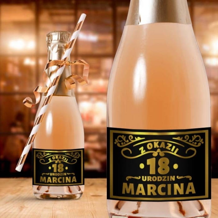Zestaw składa się z 10 samoprzylepnych etykiet, które są łatwe do nałożenia na front butelki z mini szampanem. Czarne tło z połyskującymi złotymi akcentami dodaje im elegancji i uroku. Etykiety doskonale pasują do standardowych mini butelek szampana. Klej na odwrocie powoduje, że nakładanie ich na butelki jest szybkie i łatwe. Imię jubilata umieszczone na dole naklejek powoduje, że taki upominek jest absolutnie niepowtarzalny.