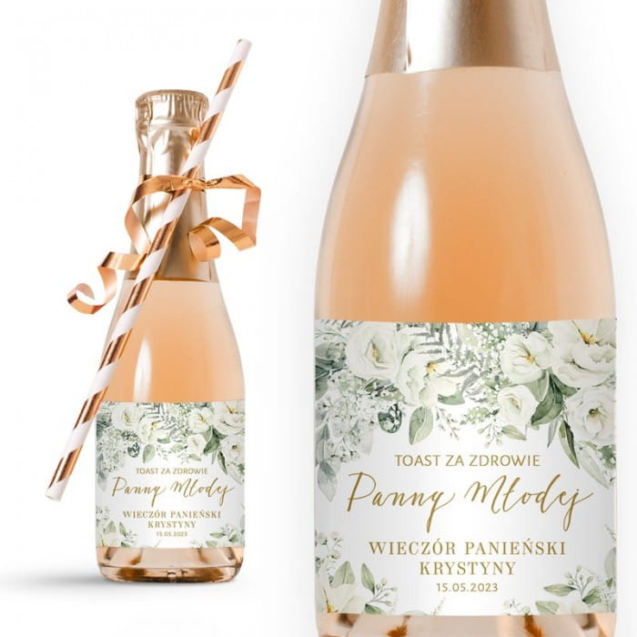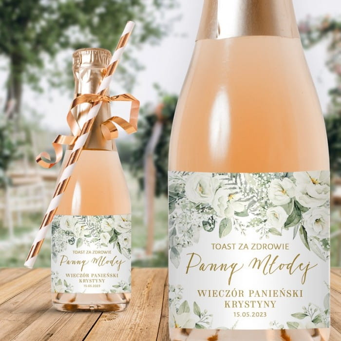 - W poszukiwaniu podziękowania dla dziewczyn na panieński warto wybrać to personalizowane. Idealnie jako upominek sprawdzą się mini szampany, które można zakupić stacjonarnie w dowolnym sklepie. Naszą propozycją do udekorowania butelek są etykiety samoprzylepne na mini szampana. Z pewnością całość będzie prezentować się efektownie i wyjątkowo. Etykietki udekorowane w kwiatową grafikę w biało-zielonej kolorystyce sprawdzą się świetnie na imprezę panieńską w każdym stylu. Butelki wzbogacone o etykiety będą świetnie uzupełniać aranżację stołu. Jeżeli planujesz podarować dziewczynom boxy prezentowe, to taki mini szampan będzie pięknym dopełnieniem zestawu.
