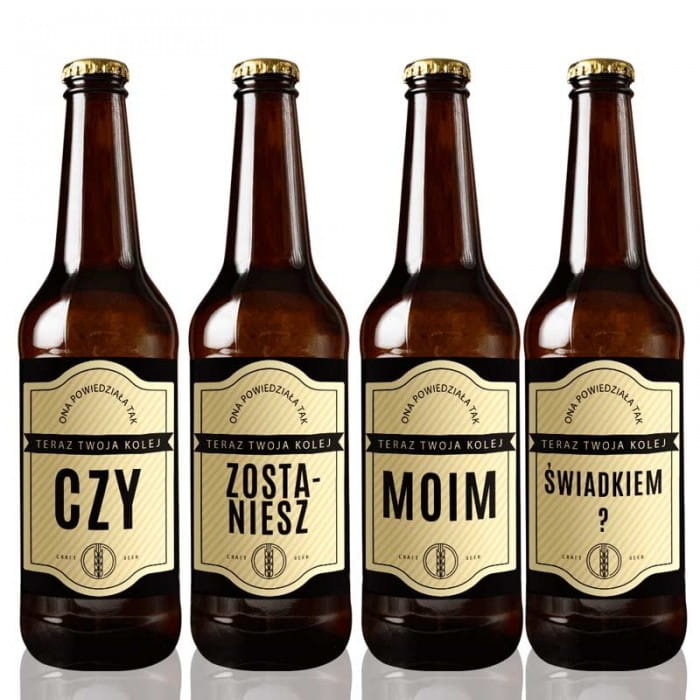 - Piwa z taką etykietą możesz rozdać w czasie wieczoru kawalerskiego. Pamiętaj, by od nich zacząć, aby goście pamiętali, o co ich poprosiłeś. Może być to doskonały początek wieczoru kawalerskiego. Możesz też poprosić kelnera, aby przyniósł je na tacy. To niezwykle udany sposób, by poprosić kogoś na świadka.