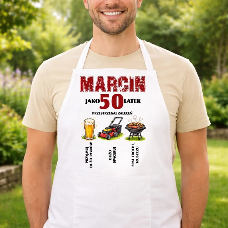 Biały fartuch wyróżnia się humorystycznym nadrukiem z imieniem oraz wiekiem, który nadaje mu indywidualnego charakteru. Grafika nawiązuje do męskich przyjemności - grillowania, odpoczynku i dobrego jedzenia. Dzięki personalizacji fartuch staje się niepowtarzalny i dopasowany do konkretnej osoby.
