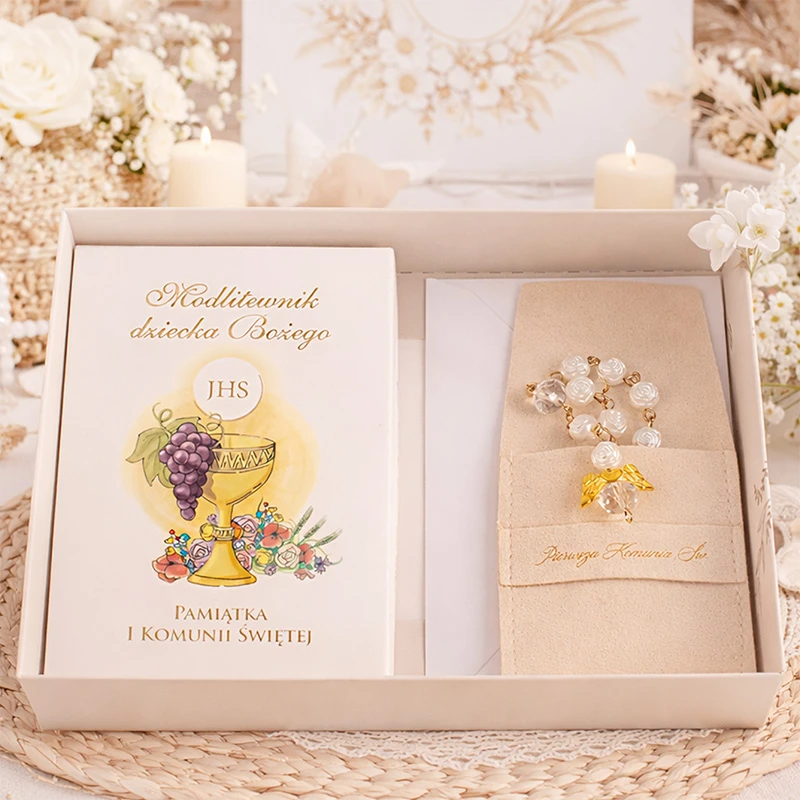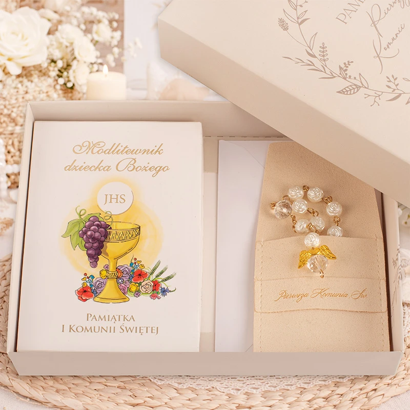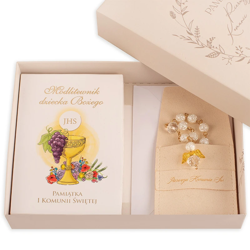 Zestaw idealnie sprawdzi się jako Pamiątka Pierwszej Komunii Świętej zarówno dla chłopca, jak i dla dziewczynki. To uniwersalny prezent, który można wręczyć od rodziców, chrzestnych, dziadków lub bliskich, podkreślając wyjątkowy charakter uroczystości. Dzięki praktycznym elementom, takim jak modlitewnik i różaniec, zestaw może towarzyszyć dziecku także na co dzień, wspierając w dalszym poznawaniu wiary. Jednocześnie stanowi estetyczną pamiątkę, do której można wracać po latach, przypominając sobie ten ważny dzień.