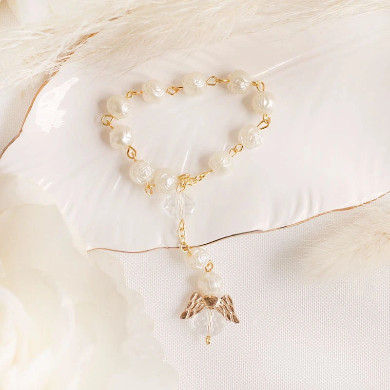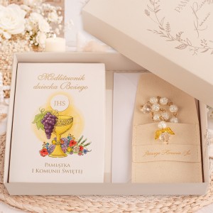 W skład zestawu wchodzi modlitewnik „Modlitewnik dziecka Bożego”, mały różaniec, miękkie zamszowe etui oraz koperta. Całość utrzymana jest w jasnej, subtelnej kolorystyce, dzięki czemu prezentuje się estetycznie i pasuje do charakteru uroczystości. Zestaw zapakowany jest w ozdobne pudełko. Dołączona koperta pozwala dodatkowo wykorzystać zestaw jako formę wręczenia pieniędzy w estetyczny sposób.