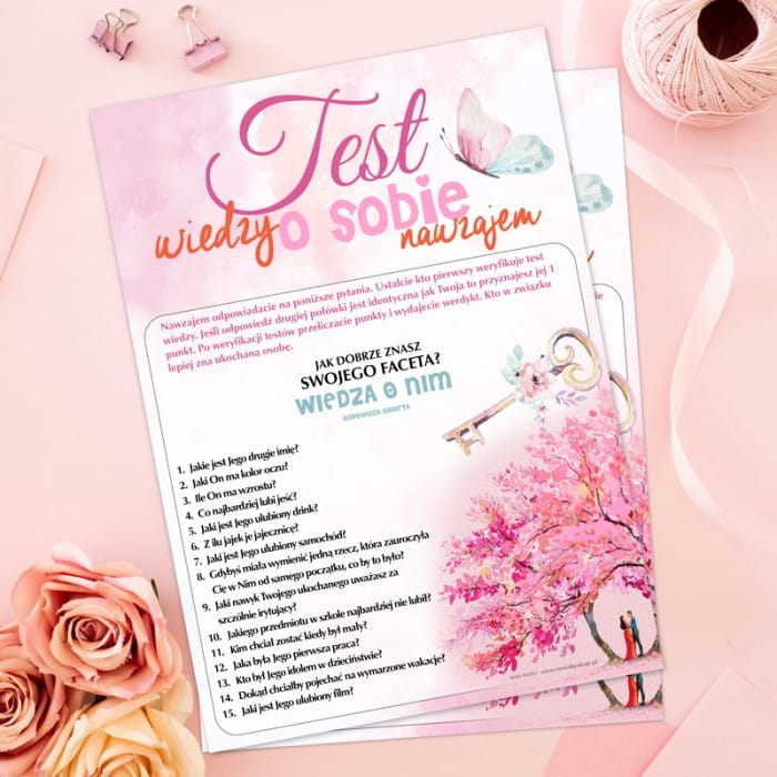 - Chcesz sprawdzić, czy rzeczywiście wszystko o sobie wiecie i urozmaicić walentynkowy wieczór? Gra dla pary na Walentynki pozwoli zweryfikować wiedzę i porównać odpowiedzi. Test wiedzy o sobie składa się z 15 pytań. Wśród nich znajdziecie te proste typu: Jakie jest jego drugie imię?, jak i te trudniejsze: Kto był jego idolem z dzieciństwa? Karta ma format A4. Na górze znajduje się duży napis: Test wiedzy o sobie nawzajem. Poniżej znajduje się krótka i instrukcja, a dalej pytania. Gra dla pary na Walentynki jest ozdobiona grafiką motyla, a także kwitnącego na różowo drzewa, pod którym spotkała się para. Wśród grafik znajduje się również klucz – symbol wiedzy i rozwiązania zagadki.
