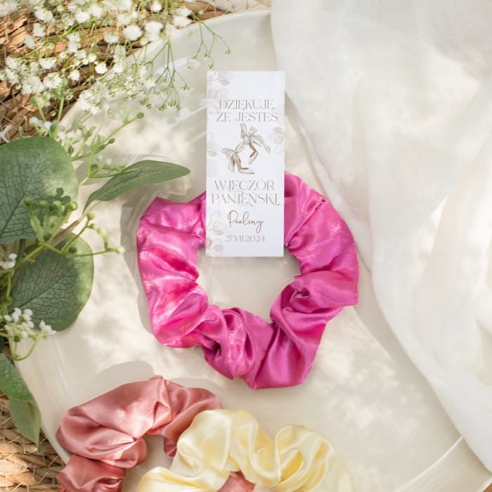 Urocze gumki do włosów typu scrunchies to hit modowy! Podaruj każdej uczestniczce imprezy gumkę z personalizowanym bilecikiem w ramach upominku! Dziewczyny kochają takie dodatki.