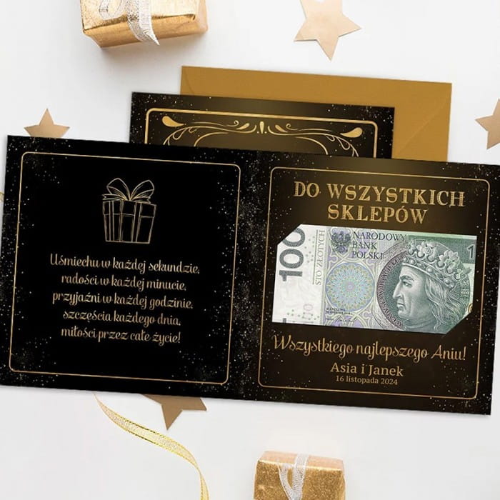 - Pieniądze w prezencie umożliwią wybór prezentu według własnych preferencji. Jest to idealna opcja dla tych, którzy preferują otrzymywanie gotówki w ramach upominku. To wyjątkowe rozwiązanie pozwala Ci podarować bliskiej osobie swobodę wyboru i możliwość zakupu czegoś, czego naprawdę pragnie. Karta podarunkowa jest wielofunkcyjna, przecież pieniądze można wydać w dowolnym sklepie. Obdarowana osoba może wybrać sobie, co tylko zechce: od ubrań, po elektronikę, kosmetyki czy książki. Dzięki temu masz pewność, że prezent zawsze trafi w gust obdarowanej osoby. Niech ta elegancka karta podarunkowa stanie się idealnym rozwiązaniem dla Ciebie, gdy szukasz oryginalnego i personalizowanego prezentu na urodziny dla bliskiej osoby!