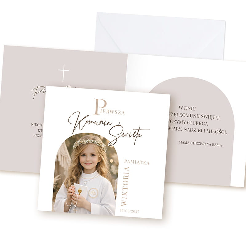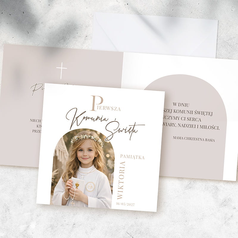 Kartka komunijna ze zdjęciem może być samodzielnym prezentem lub stylowym dodatkiem do większego upominku – np. Biblii, albumu czy koperty z życzeniami. To piękny gest od chrzestnych, dziadków, rodziny lub przyjaciół, który nadaje uroczystości jeszcze bardziej osobisty i wyjątkowy wymiar.