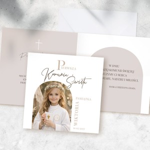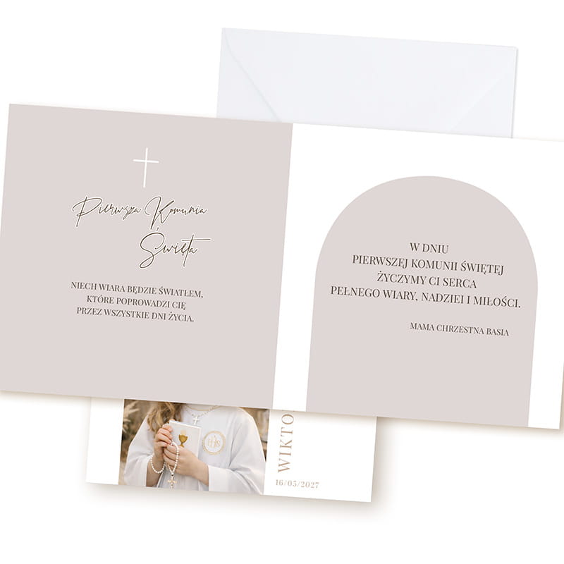 Okładkę kartki okolicznościowej zdobi przesłane zdjęcie, starannie wkomponowane w jasną, subtelną kompozycję nawiązującą do komunijnej estetyki. Delikatne detale graficzne oraz napis „Pierwsza Komunia Święta” podkreślają uroczysty charakter wydarzenia. W środku znajdują się gotowe życzenia komunijne, a całość uzupełnia elegancka, biała koperta.