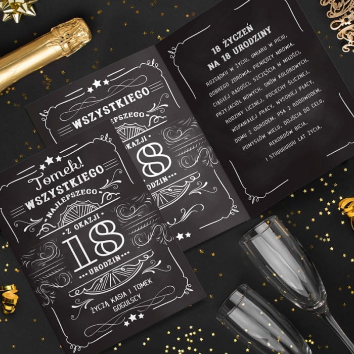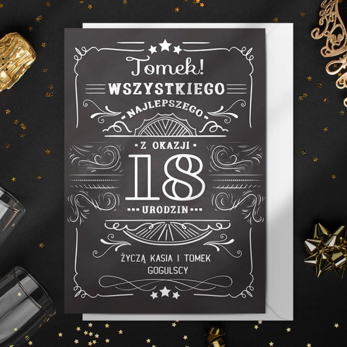 - Personalizowana kartka na 18 urodziny z 18 życzeniami to ciekawy pomysł na dopełnienie prezentu. Na kartce dominują klasyczne kolory, czyli biel i czerń. Na ciemnym tle białe napisy oraz elementy graficzne prezentują się efektownie. Grafika na okładce nawiązuje układem do etykiety kultowej, amerykańskiej whiskey prosto ze stanu Tennessee. Pomiędzy ozdobnikami wkomponowane są tradycyjne życzenia Wszystkiego najlepszego, które uzupełni liczba symbolizująca wiek solenizanta oraz jego imię i Twój podpis. W środku kartki znajdzie się 18 życzeń.