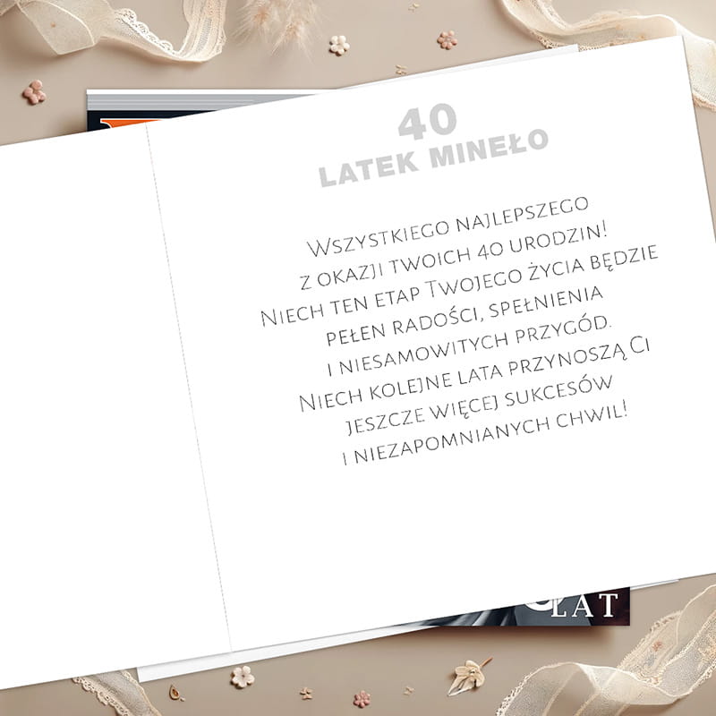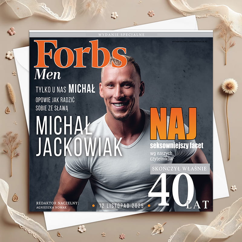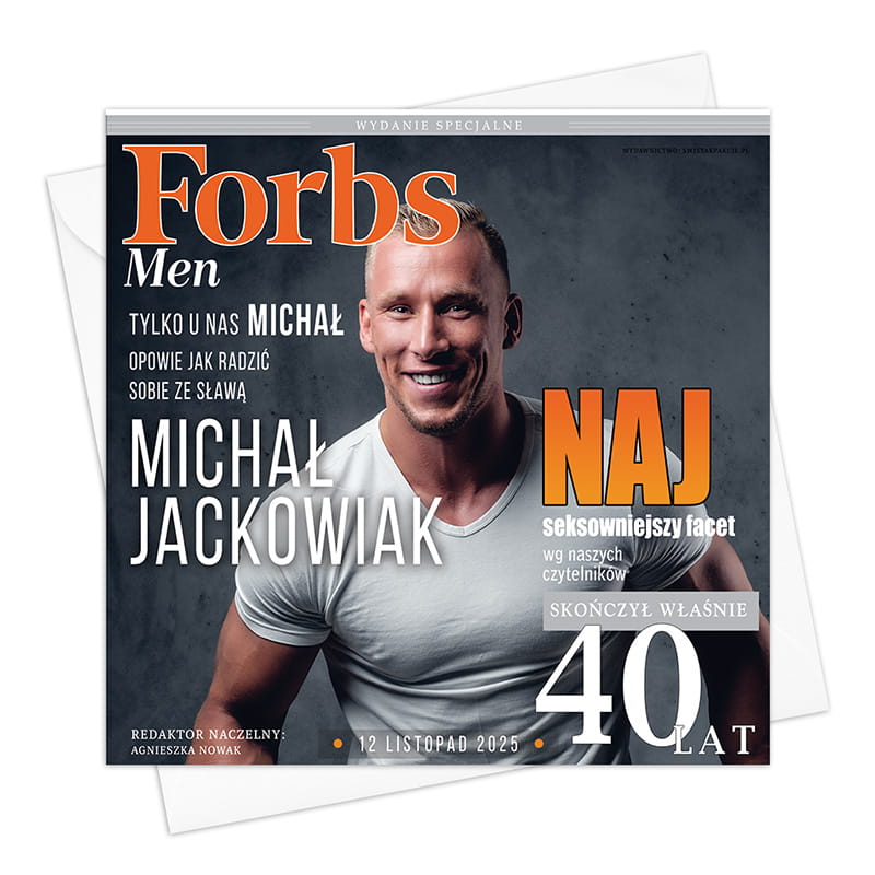 Front kartki przypomina klasyczną okładkę magazynu, na której znajduje się zdjęcie solenizanta, jego imię, data urodzin oraz dedykowane hasła w stylu prawdziwej prasy. Wnętrze kartki zawiera gotowe życzenia urodzinowe. Tytuł z nagłówkiem głosi: "Forbs Men Tylko u nas [Imię] opowie jak radzić sobie ze sławą [Imię i nazwisko]" Po prawej stronie kartki znajduje się tekst: "NAJ seksowniejszy facet wg naszych czytelników skończył właśnie 40 lat". W środku kartki znajduje się tekst życzeń:"40 LATEK MINĘŁO Wszystkiego najlepszego z okazji twoich 40 urodzin! Niech ten etap Twojego życia będzie pełen radości, spełnienia i niesamowitych przygód. Niech kolejne lata przynoszą Ci jeszcze więcej sukcesów i niezapomnianych chwil!"