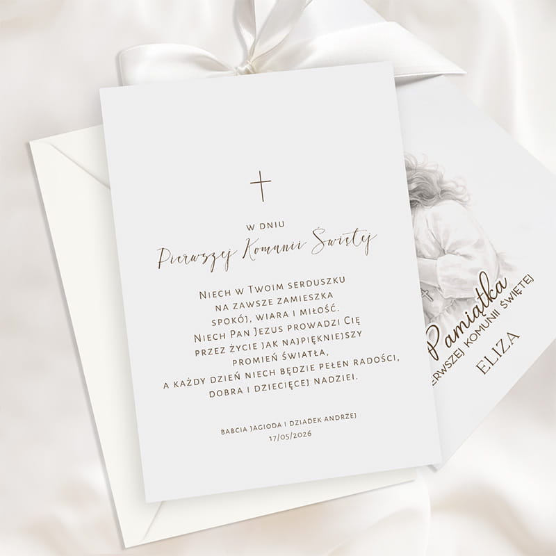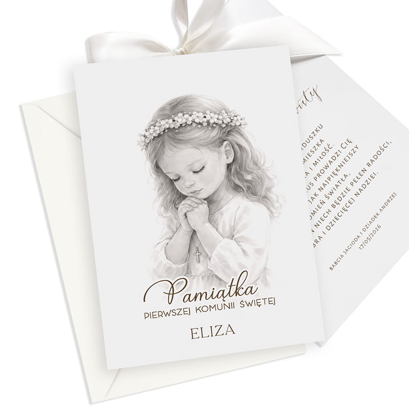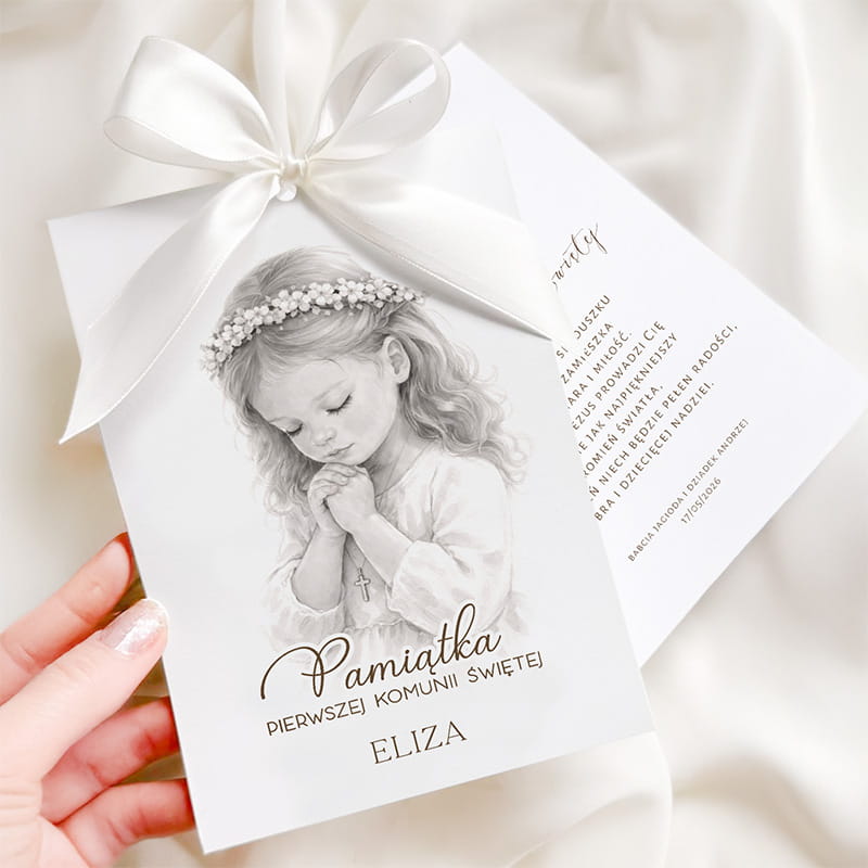 Na froncie kartki znajduje się łagodna, artystyczna ilustracja dziewczynki w stroju komunijnym, przedstawionej w chwili modlitwy. Wianek na głowie i krzyżyk podkreślają symbolikę sakramentu, a stonowana paleta barw nadaje grafice lekkości i elegancji. Napis informujący o okazji oraz personalizacja imieniem nadają kartce indywidualny charakter. W środku umieszczono starannie dobrane życzenia komunijne, które odnoszą się do wiary, dobra, Bożej opieki i radości towarzyszącej dziecku na dalszej drodze życia. Całość przewiązana jest ozdobną wstążką, która dodaje kartce uroczystej formy.