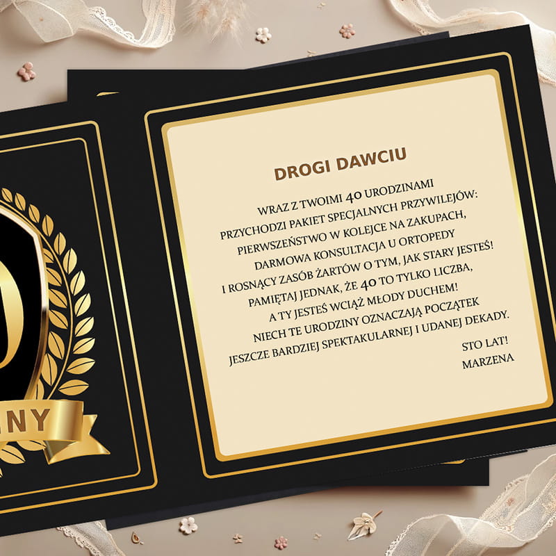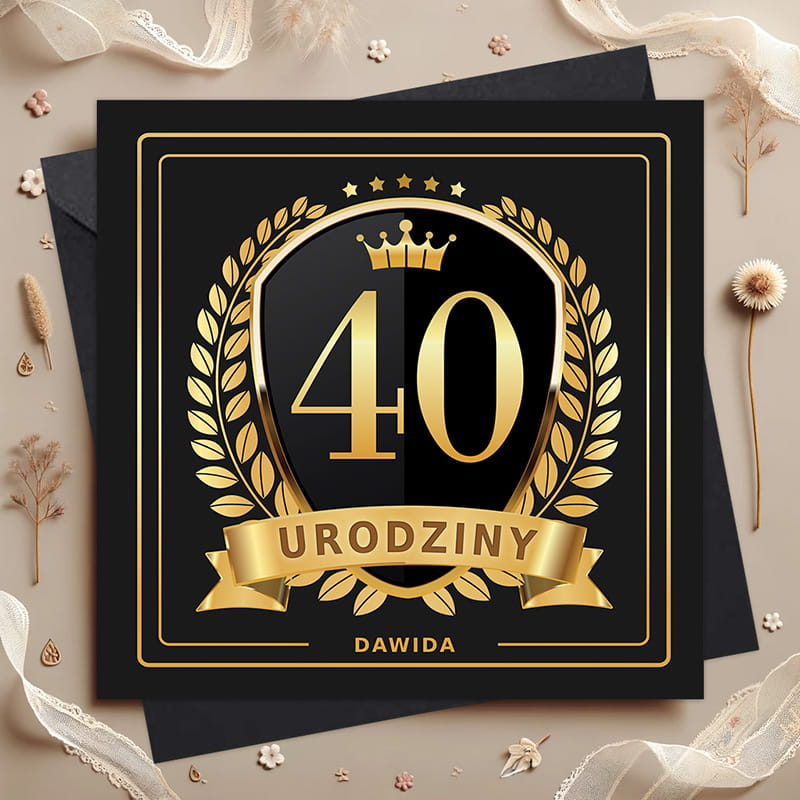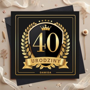 Front kartki zdobi czarne tło z kontrastującym nadrukiem w odcieniach złota. Centralnie umieszczona liczba 40, korona, laury oraz wstęga z napisem „Urodziny” tworzą efekt godny królewskiego jubileuszu. Na dole znajduje się personalizowany napis, który można dostosować do imienia jubilata. Wnętrze kartki zawiera życzenia: "Drogi/Droga [imię] Wraz z Twoimi 40 urodzinami Przychodzi pakiet specjalnych przywilejów: Pierwszeństwo w kolejce na zakupach, Darmowa konsultacja u ortopedy I rosnący zasób żartów o tym, jak stary/a jesteś! Pamiętaj jednak, ze 40 to tylko liczba, A ty jesteś wciąż młody/a duchem! Niech te urodziny oznaczają początek Jeszcze bardziej spektakularnej i udanej dekady, Sto lat! [podpis]". Do kartki dołączona jest czarna koperta.