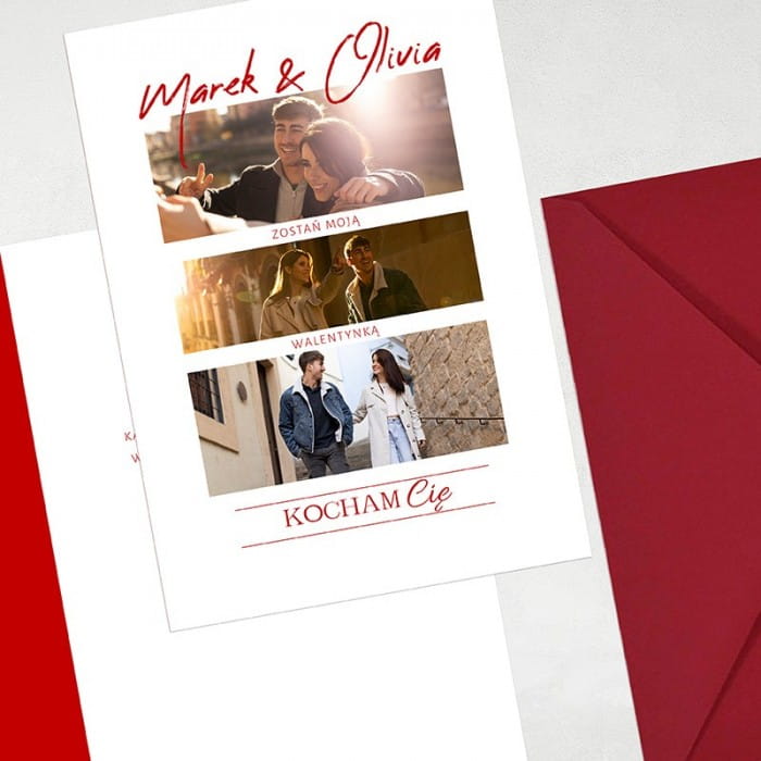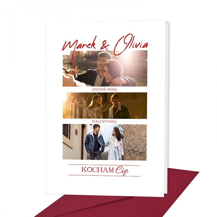 Ta kartka to niezwykły prezent, który można spersonalizować, dodając własne zdjęcia i tekst. To właśnie te detale sprawiają, że prezent staje się jeszcze bardziej intymny i osobisty. Słowa "Zostań moją Walentynką" nadają kartce romantyczny wydźwięk, zapraszając do świętowania miłości w najbardziej bezpośredni sposób. Czerwony akcent w tekście oddaje pasję i głębokie uczucia, które towarzyszą każdemu, kto jest zakochany.