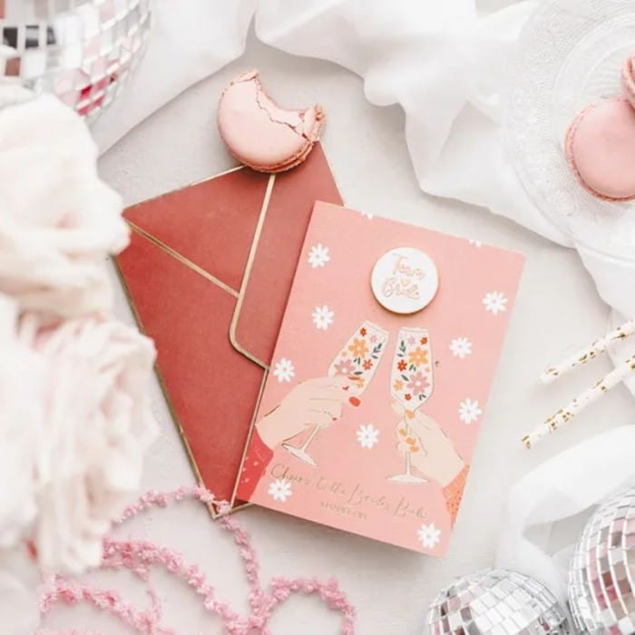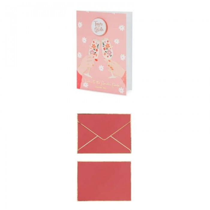 Kartę dostępną na naszej stronie internetowej przygotowaliśmy w klasycznej formie składanej. Wykonana jest w modnym kolorze różu. Na froncie możesz dostrzec wzór kieliszków uniesionych w geście toastu, które wypełnione są drobnymi kwiatami. Nad nimi umieściliśmy napis „Team Bride”, który wskazuje, kto jest adresatem upominku. Dopełnieniem całości jest elegancka koperta w kolorze ciemnoróżowym, którą uzupełniają złote obramowania. Kartka prezentuje się niezwykle elegancko i gustownie. Doskonale sprawdzi się wręczona osobiście lub jako dodatek wrzucony do opakowania z prezentem. Postawcie na wspomnienia, bo to te zostaną z przyszłą żoną na zawsze i zadbajcie o każdy szczegół tak ważnego wieczoru.