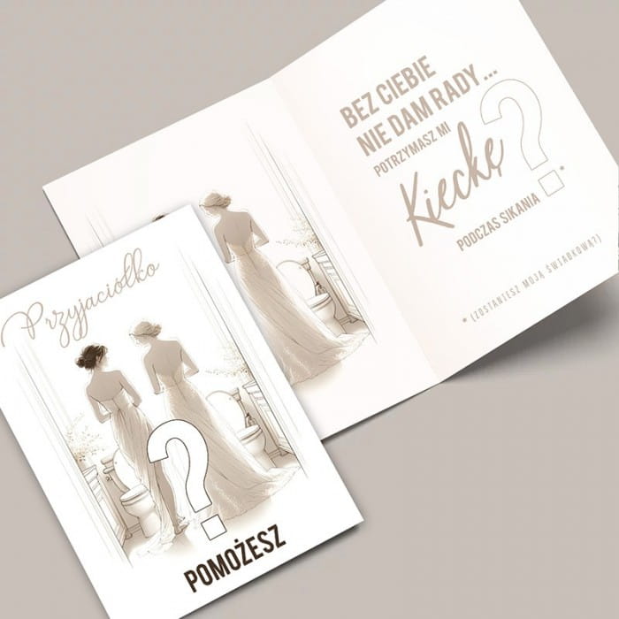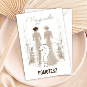Zabawna ilustracja dwóch kobiet w sukniach, zwróconych plecami do widza, tworzy atmosferę pełną oczekiwania i radości. Eleganckie pismo na okładce z pytaniem "Przyjaciółko, pomożesz?" wprowadza w klimat pełen emocji. Wnętrze kartki kontynuuje tę beztroską tonację, z humorem pyta o codzienne sytuacje, które przyjmują szczególne znaczenie w okresie przygotowań do ślubu. Tekst: "Bez Ciebie nie dam rady... Potrzymasz mi kieckę podczas sikania?" dodaje humorystycznego akcentu do całości.