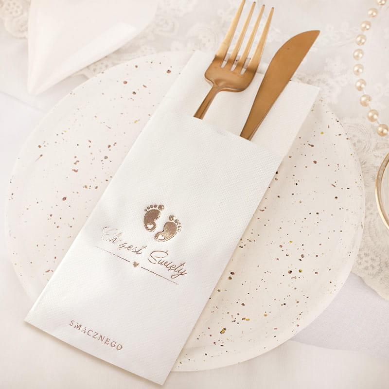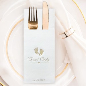 Oprawa stołu ma ogromne znaczenie podczas organizacji przyjęcia z okazji Chrztu Świętego. To właśnie detale, takie jak kieszonka na sztućce, wpływają na spójny, elegancki wygląd dekoracji. Zestaw 20 sztuk kieszonek z kolekcji „Małe Stópki” to nie tylko praktyczny element, ale przede wszystkim wyjątkowa dekoracja na chrzciny, która przyciąga uwagę gości. Złoty nadruk i subtelny napis „Chrzest Święty” nadają całości uroczystego charakteru i świetnie komponują się z pozostałymi dodatkami w podobnej stylistyce.