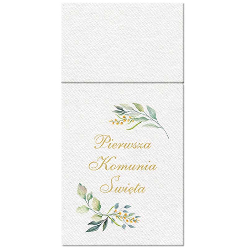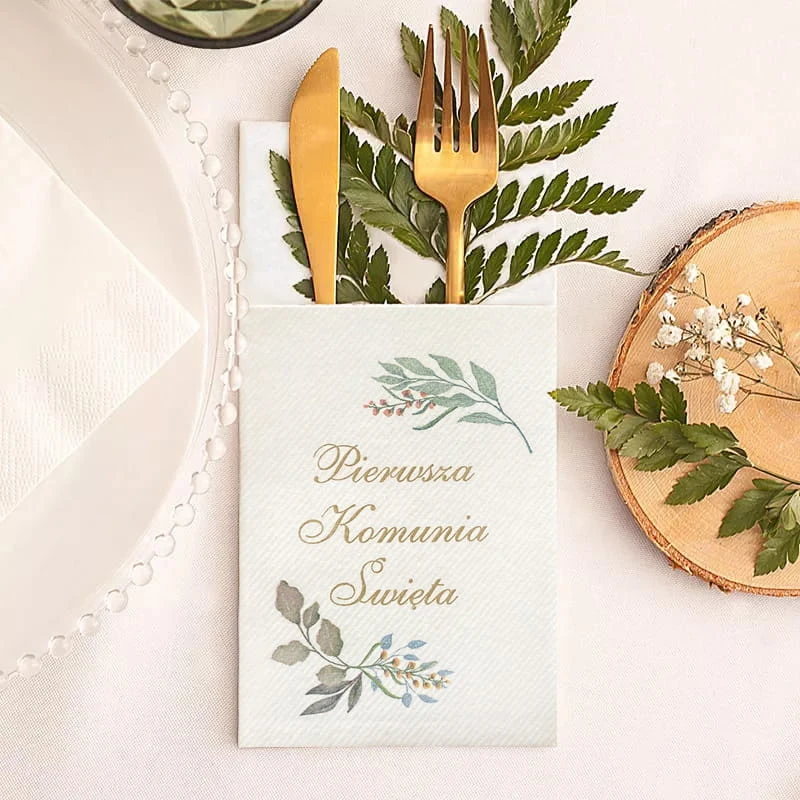 W zestawie znajduje się 25 kieszonek wykonanych z wysokiej jakości papieru, utrzymanych w jasnej tonacji z delikatnym nadrukiem florystycznym oraz napisem „Pierwsza Komunia Święta”. Kieszonki mają praktyczną formę umożliwiającą umieszczenie w nich zarówno widelca, jak i noża, łyżeczki czy serwetki. Ich uniwersalny rozmiar sprawia, że pasują do większości typów sztućców. Delikatna grafika gałązek dopełnia całość w stylu rustykalnym lub naturalnym, często wybieranym na uroczystości komunijne.