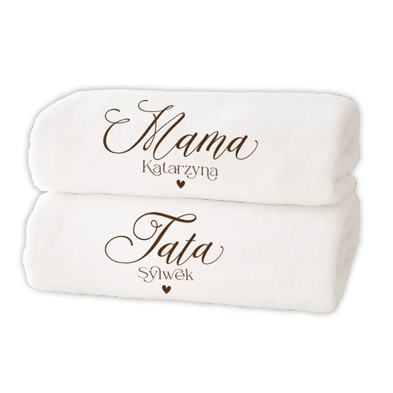 Komplet składa się z dwóch miękkich ręczników w klasycznym, jasnym kolorze. Każdy z nich ozdobiony jest eleganckim napisem „Mama” i „Tata” oraz imieniem, które umieszczamy pod spodem – to właśnie imiona podlegają personalizacji. Całość uzupełniają subtelne serduszka oraz stylowa, dekoracyjna czcionka, nadająca ręcznikom wyjątkowego charakteru.