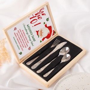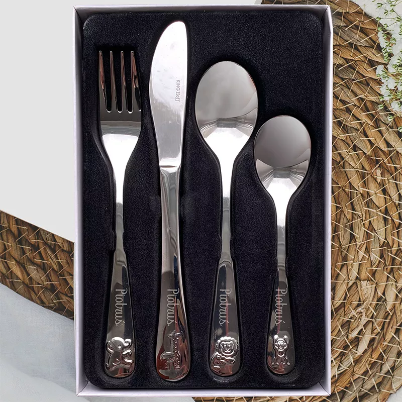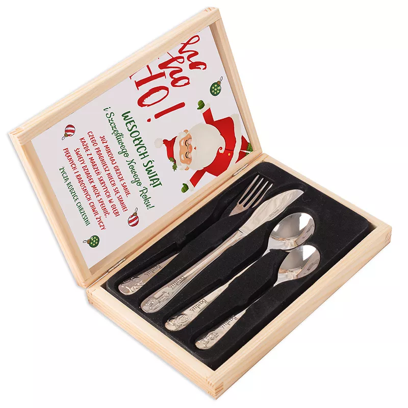 Zestaw zawiera cztery sztućce: łyżeczkę, łyżkę, widelec i nóż, wykonane ze stali nierdzewnej o błyszczącym wykończeniu. Rękojeści ozdobione są wytłaczanymi motywami zwierzątek oraz grawerem z imieniem dziecka, co nadaje całości unikalnego charakteru. Cały komplet umieszczony jest w solidnej, jasnej szkatułce z naturalnego drewna. Wewnątrz znajduje się wesoła grafika świąteczna z życzeniami „Wesołych Świąt” i miejscem na podpis od darczyńcy. Sztućce osadzone są w czarnej piance, która stabilizuje je i chroni przed uszkodzeniami.