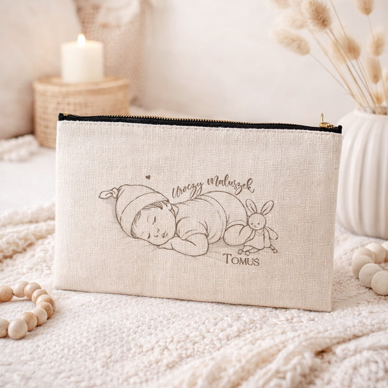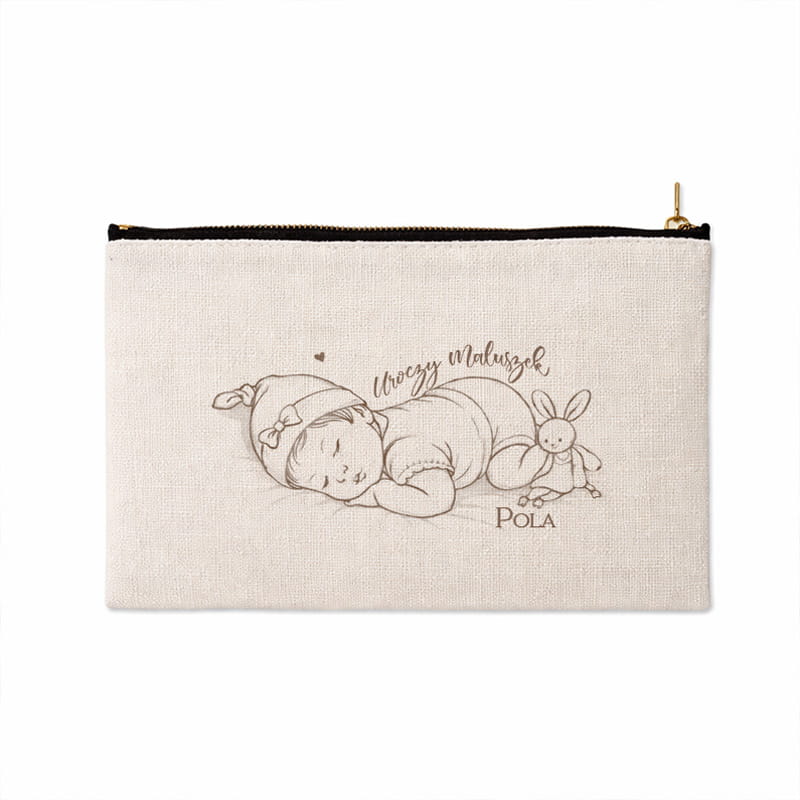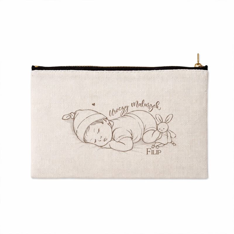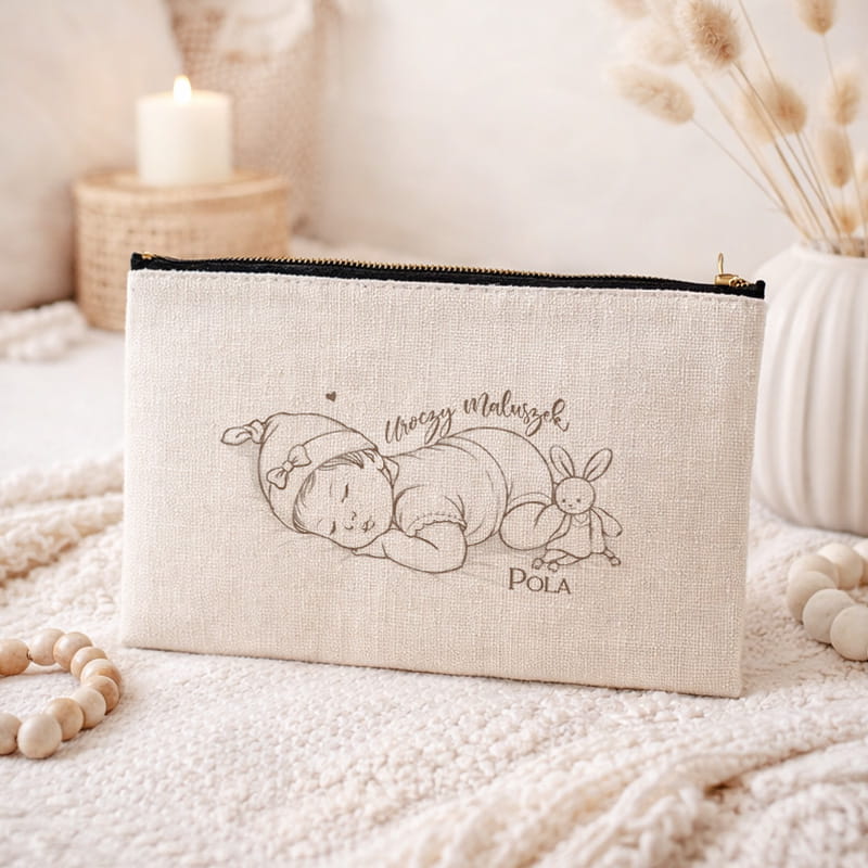 Produkt został uszyty z jasnej tkaniny o naturalnej strukturze, idealnie wpisującej się w styl boho i minimalistyczne dodatki dziecięce. Przód kosmetyczki zdobi delikatna grafika przedstawiająca śpiącego maluszka oraz personalizacja w postaci imienia. Stonowana kolorystyka sprawia, że kosmetyczka prezentuje się subtelnie i estetycznie. Dostępne są warianty dedykowane dla chłopca lub dziewczynki. Zamek błyskawiczny ułatwia szybkie otwieranie i zabezpiecza zawartość przed wypadnięciem.