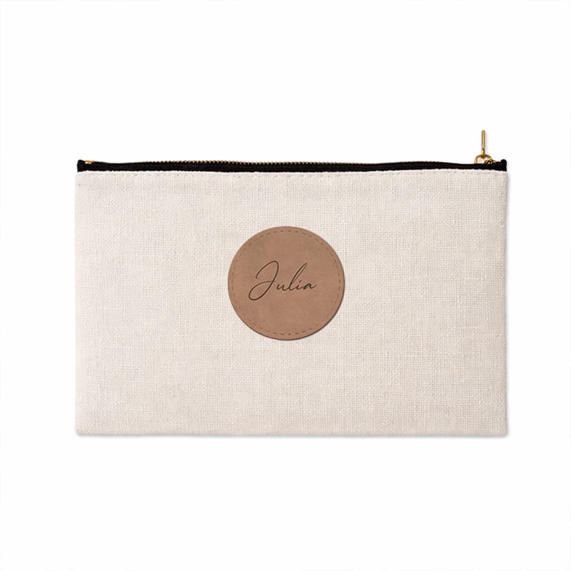 Beżowa kosmetyczka wykonana została ze strukturalnej tkaniny. Na froncie znajduje się okrągła naszywka z ekoskóry z eleganckim napisem – imieniem osoby, której kosmetyczka zostanie podarowana. Ten mały, ale znaczący detal sprawia, że każda sztuka staje się jedyna w swoim rodzaju.