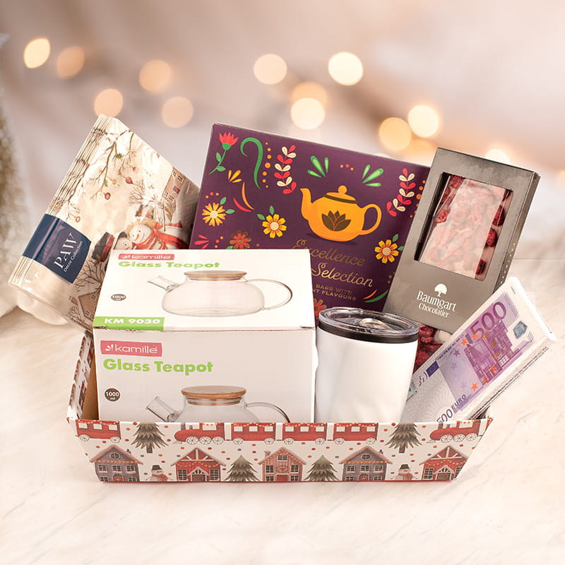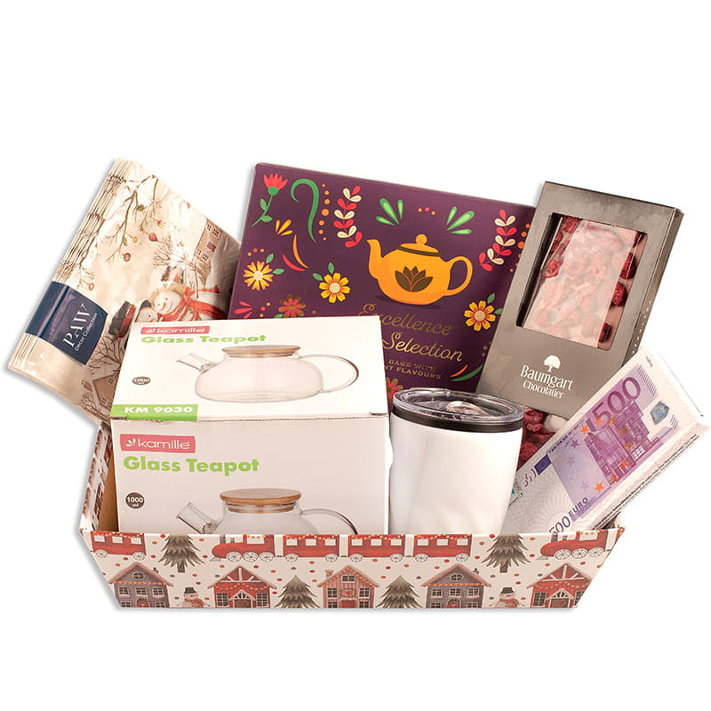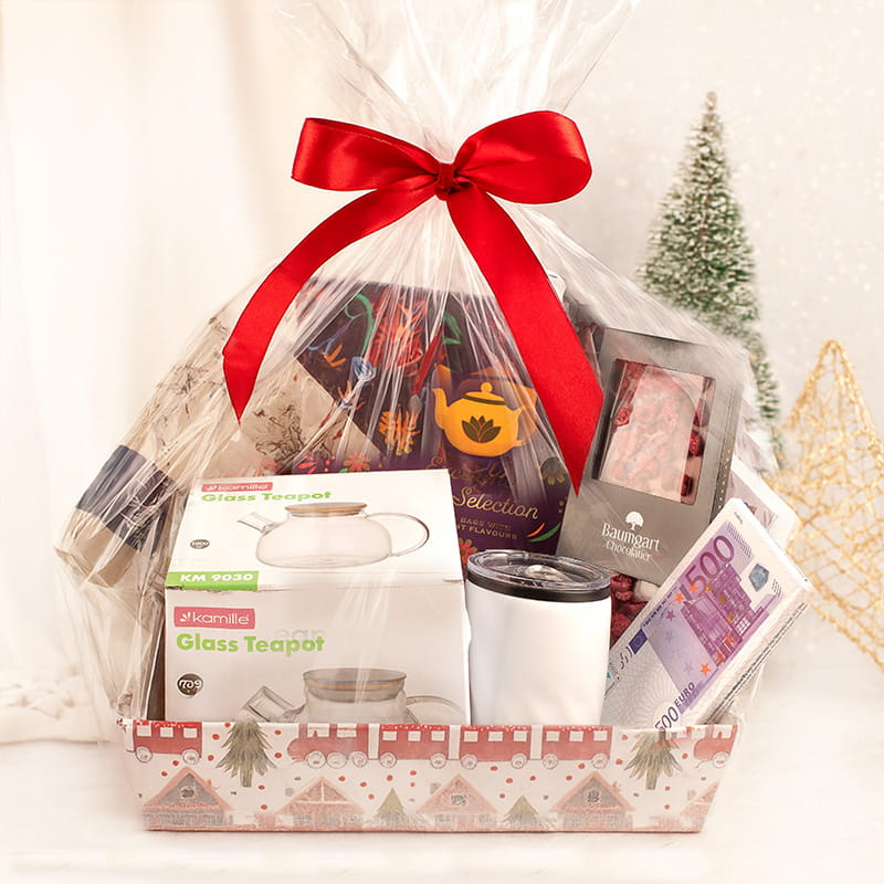 W środku znajduje się pojemny szklany dzbanek do herbaty Kamille z pokrywką z elementem drewnianym, który nadaje mu minimalistyczny, nowoczesny wygląd. Obok niego – kubek termiczny o uniwersalnym designie, świetny do zabrania ulubionego napoju do pracy czy na spacer. Aromatyczna herbata liściasta, świąteczne serwetki oraz dwie tabliczki czekolady (klasyczna oraz z dodatkiem malin) dopełniają całości. Całość została umieszczona w solidnym kartonowym koszu z świątecznym motywem, dzięki czemu prezent wygląda spójnie i klimatycznie.