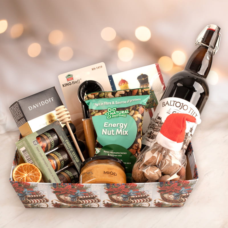 Elegancki świąteczny zestaw upominkowy, który nie wymaga dodatkowego pakowania. W środku znajdziesz aromatyczną kawę, syropy do kawy, naturalny miód, orzechy z czapeczką, dziadka do orzechów, zakwas, serwetki i więcej – wszystko w świątecznym pudełku. To uniwersalny kosz prezentowy na święta gotowy do wręczenia. Idealny prezent dla bliskiej osoby na Boże Narodzenie, który łączy smak, styl i funkcjonalność.