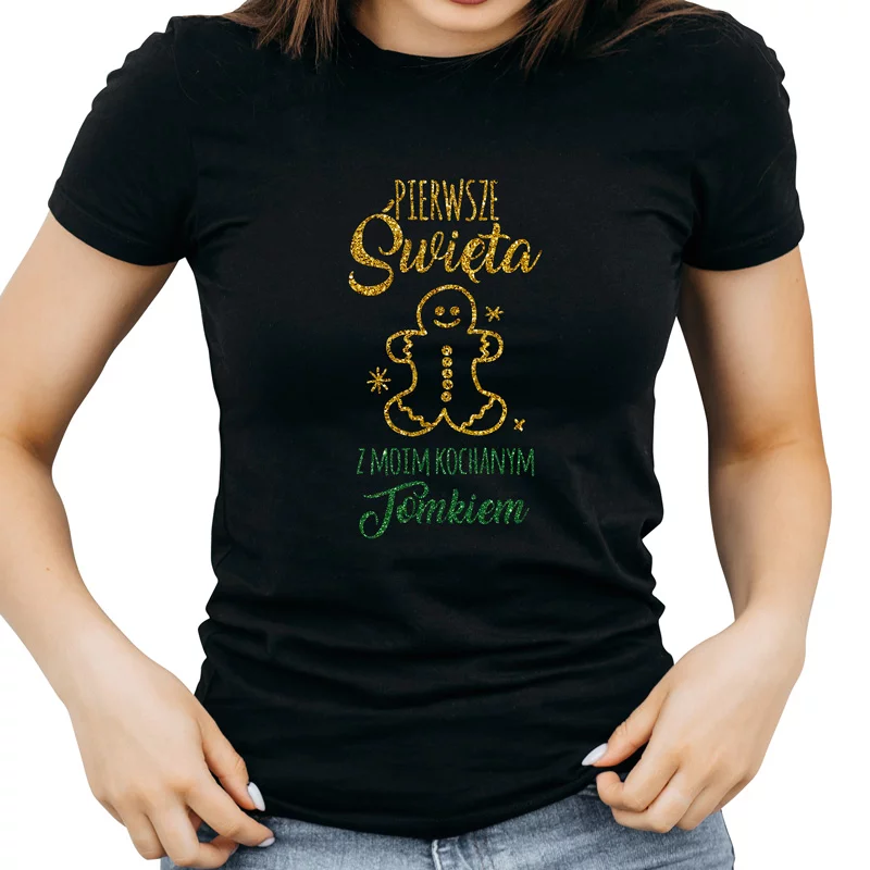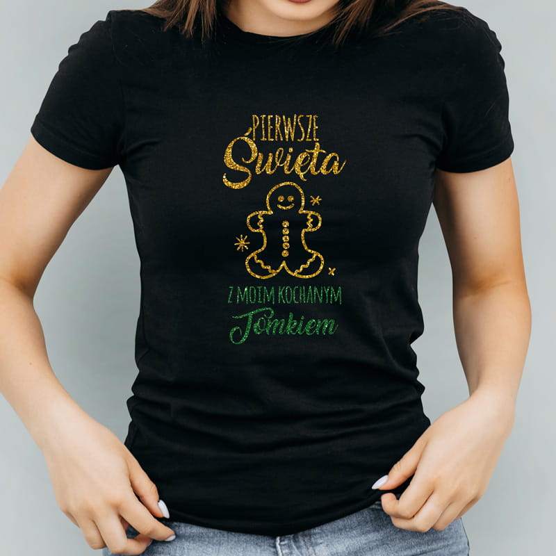 Koszulka z napisem „Pierwsze Święta z moim kochanym [imię]” to wyjątkowy prezent dla kobiety, która spędza pierwsze Boże Narodzenie ze swoim partnerem. Brokatowy nadruk z imieniem oraz urocza grafika piernika tworzą niepowtarzalny świąteczny klimat. To osobisty, wygodny i estetyczny dodatek, który podkreśla wyjątkowy czas spędzony we dwoje.