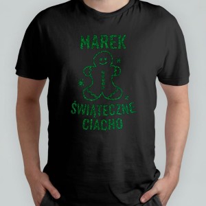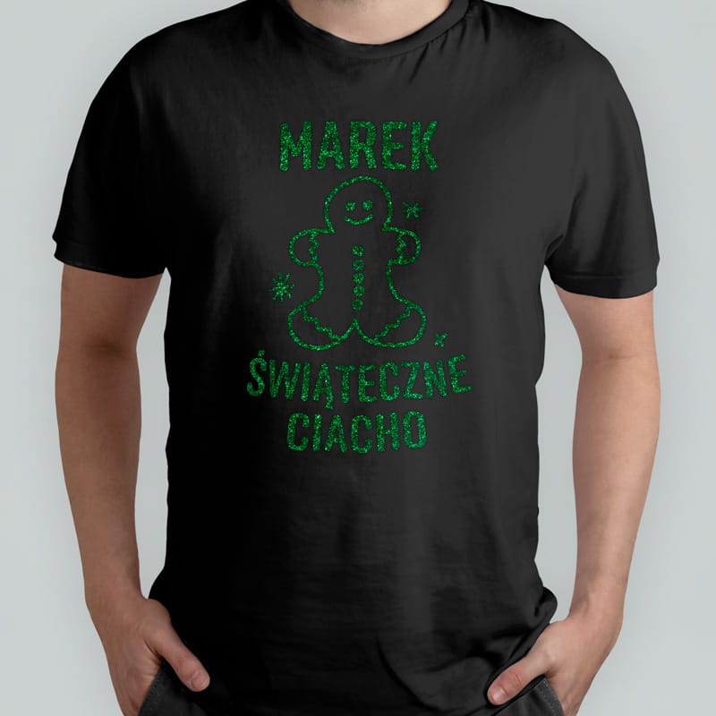 Koszulka wykonana została z miękkiej bawełny, która gwarantuje komfort noszenia i dobrą oddychalność. Dostępna jest w klasycznym, czarnym kolorze, który podkreśla intensywny, zielony brokatowy nadruk. Na środku umieszczona została grafika piernika oraz tekst "świąteczne ciacho", który można spersonalizować imieniem obdarowanego. Krój koszulki jest uniwersalny i pasuje do różnych sylwetek, co czyni ją idealnym wyborem dla szerokiego grona mężczyzn.