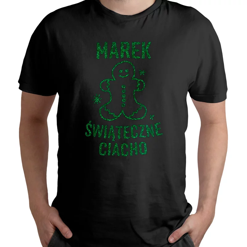 Koszulka męska z brokatowym napisem to zabawny i oryginalny pomysł na prezent świąteczny dla niego. Personalizacja z imieniem oraz nadruk w klimacie bożonarodzeniowym przyciągają wzrok i wywołują uśmiech. Świetnie sprawdzi się jako świąteczny outfit na spotkania rodzinne, firmową wigilię czy sesję zdjęciową. To idealny wybór dla mężczyzny z dystansem do siebie i poczuciem humoru.