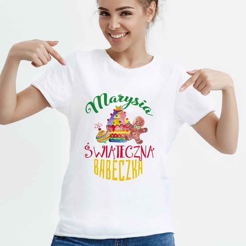 Zabawna koszulka damska z imieniem i kolorową grafiką w świątecznym stylu to doskonały prezent dla niej na Boże Narodzenie. Wyjątkowy nadruk z pierniczkiem i muffinką w połączeniu z możliwością personalizacji sprawia, że każda kobieta poczuje się wyróżniona. Idealna na spotkania rodzinne, sesje zdjęciowe i zimowe wieczory spędzone w gronie bliskich.