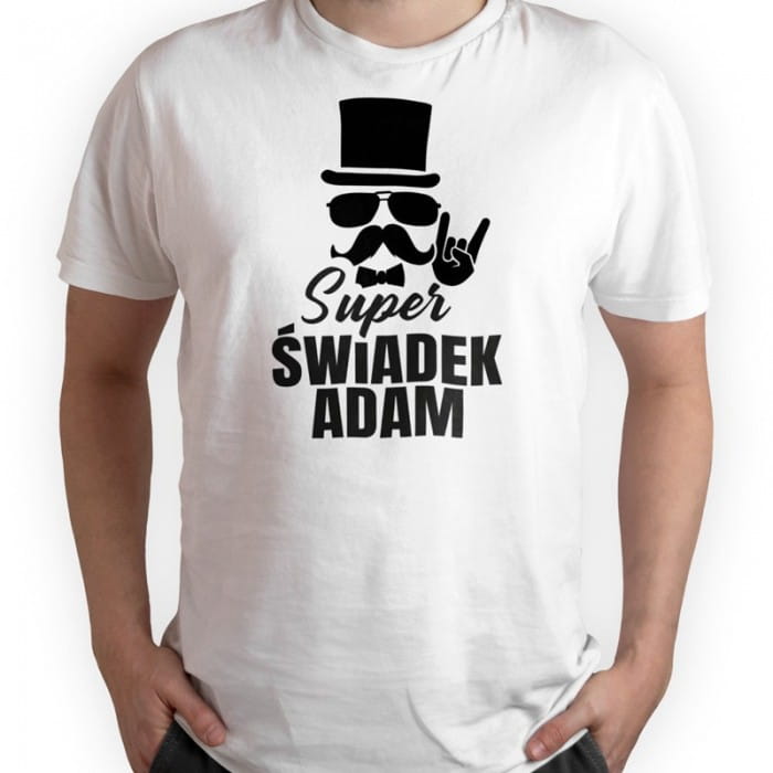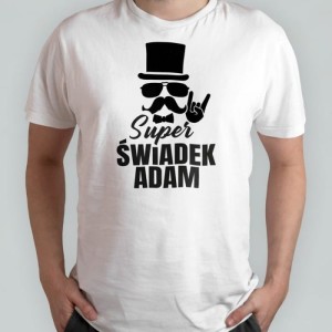 Biała koszulka o klasycznym męskim kroju, ozdobiona jest na przedniej stronie czarną grafiką. Grafika składa się z napisu Super świadek IMIĘ oraz wizerunku wąsatego mężczyzny w okularach, który ma założony cylinder oraz muchę. Jego dłoń ułożona jest w gest o nazwie diabelskie rogi. Grafika utrzymana jest w klimacie retro i ma zabawny charakter. Z pewnością będzie pasowała do osoby, która ma dystans do siebie i podchodzi do życia na luzie. Koszulka dla świadka z zabawną grafiką to świetny sposób na wyróżnienie jego poważnej roli oraz doskonała pamiątka. Personalizowany prezent to również doskonały pomysł na podziękowanie dla świadka za jego pomoc i zaangażowanie w organizację uroczystości.