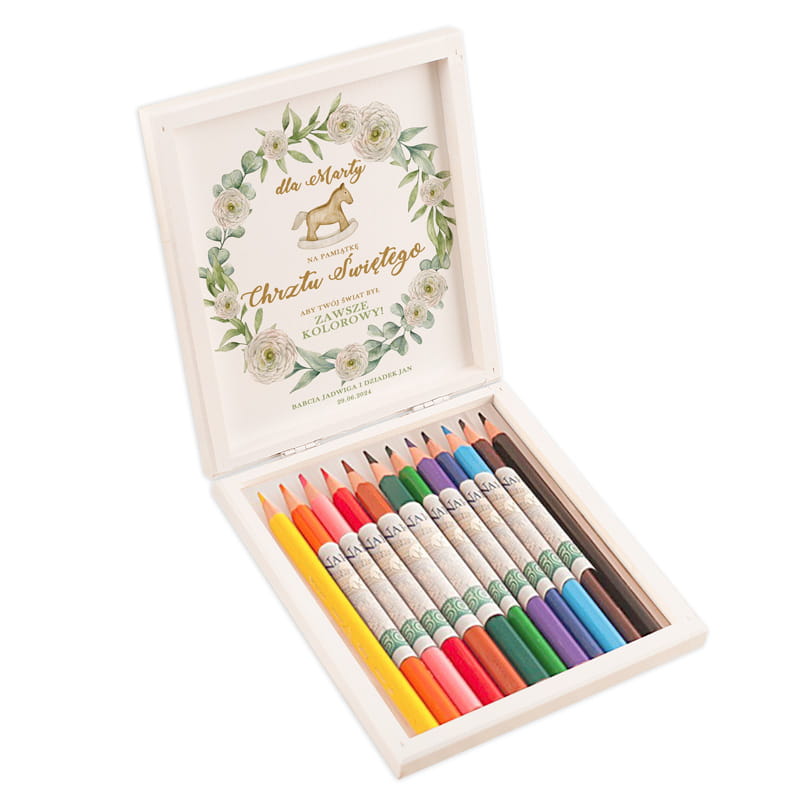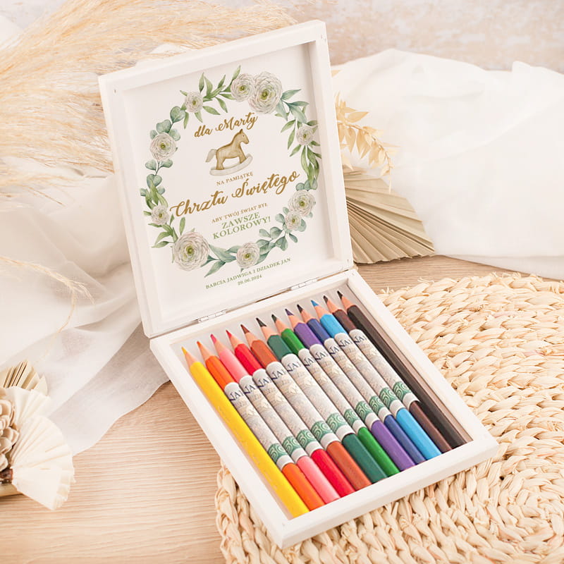 Drewniana szkatułka pomalowana na biało mieści komplet 12 kredek w intensywnych kolorach. Wnętrze wieczka zdobi nadruk z florystycznym wieńcem i konikiem – motywem pasującym do okazji chrztu. Całość uzupełnia dedykowany tekst, który można spersonalizować: imieniem dziecka, datą oraz podpisem ofiarodawców. Kompozycja utrzymana jest w delikatnych, naturalnych barwach - beżu, zieleni i złota - dzięki czemu pasuje zarówno dla dziewczynki, jak i chłopca.