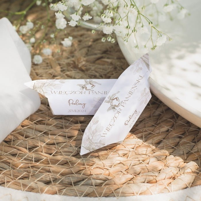 - W skład zestawu wchodzi 12 sztuk słodkich krówek. Mają tradycyjny smak, który przypomina beztroskie dzieciństwo i możesz być pewna, że pojawią się pytania o więcej cukierków! Każdy z nich jest w białym papierku z delikatną grafiką w stylu boho oraz napisem w stonowanej brązowej kolorystyce. Krówki pochodzą od polskiego producenta. Personalizacja obejmuje imię przyszłej panny młodej oraz datę imprezy. Pyszne krówki w ozdobnych papierkach na imprezę to doskonały pomysł na podziękowanie dla gości. Z powodzeniem wykorzystasz je podczas wieczoru panieńskiego, dzięki możliwości personalizacji. Imię panny młodej wraz z datą przyjęcia uzupełnione o dziewczęcą grafikę tworzą sympatyczną całość. Ten wzór przypadnie do gustu każdej zaproszonej osobie!