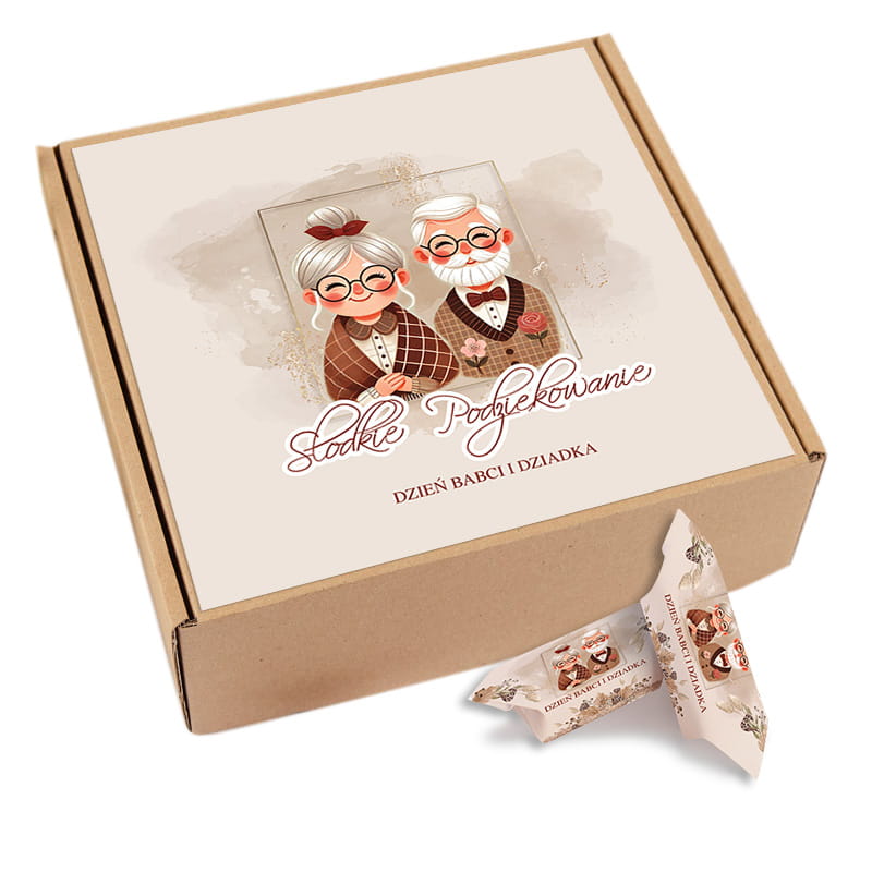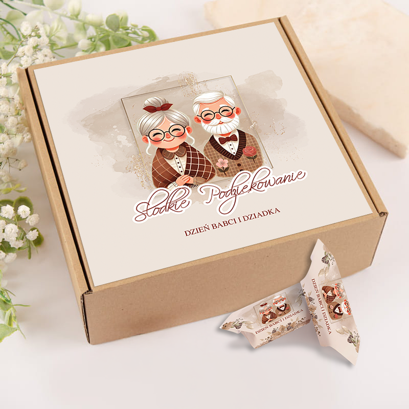 Zestaw zawiera 1 kg świeżych krówek o klasycznym mlecznym smaku, pakowanych pojedynczo w dekoracyjne papierki. Na każdym z nich znajduje się grafika przedstawiająca uśmiechniętą babcię i dziadka oraz ozdobny napis dedykowany ich świętu. Całość zapakowana jest w estetyczne pudełko z dopasowaną graficznie naklejką z napisem „Słodkie podziękowanie – Dzień Babci i Dziadka”. Zarówno wygląd, jak i jakość wykonania sprawiają, że to produkt, który dobrze sprawdzi się w większych grupach.