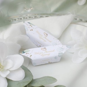 - Polskie, klasyczne krówki mleczne, zapakowane w charakterystyczny sposób, który nadaje tym słodkościom niepowtarzalnego wyglądu. Krówki mają delikatny mleczny smak i idealną, ani nie klejąca, ani zbyt kruchą konsystencję. Podczas delektowania się subtelnie rozpływają się w ustach. Każda krówka zawinięta jest ręcznie w personalizowany papierek z motywem przewodnim kolekcji Pierścionek Zaręczynowy. Oprócz charakterystycznej grafiki z motywem roślinnym i biżuterią na opakowaniu znajdzie się imię przyszłej panny młodej oraz data jej wieczoru panieńskiego.