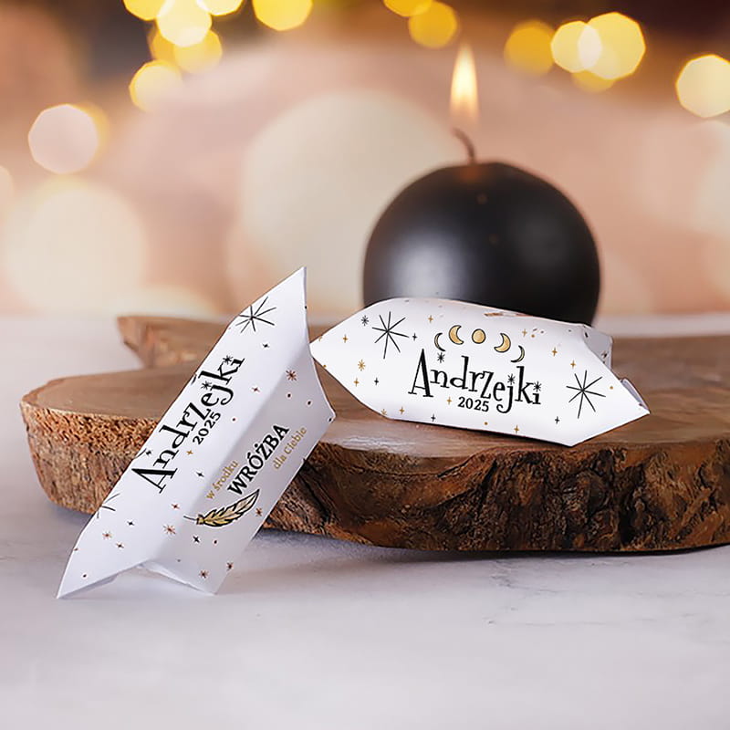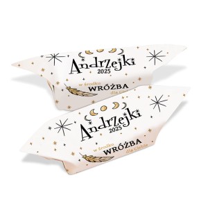 Krówka zapakowana jest w elegancki, biały papierek z napisem „Andrzejki 2025” i grafiką inspirowaną tradycjami andrzejkowymi – delikatnymi gwiazdkami i piórem, które nawiązują do atmosfery pełnej tajemnic. Po rozpakowaniu, każdy znajdzie wróżbę na wewnętrznej stronie, wybraną losowo spośród aż 130 pozytywnych i inspirujących tekstów, które na pewno wywołają uśmiech na twarzy.
