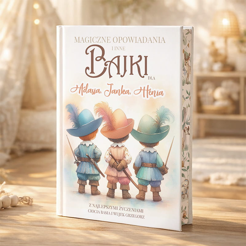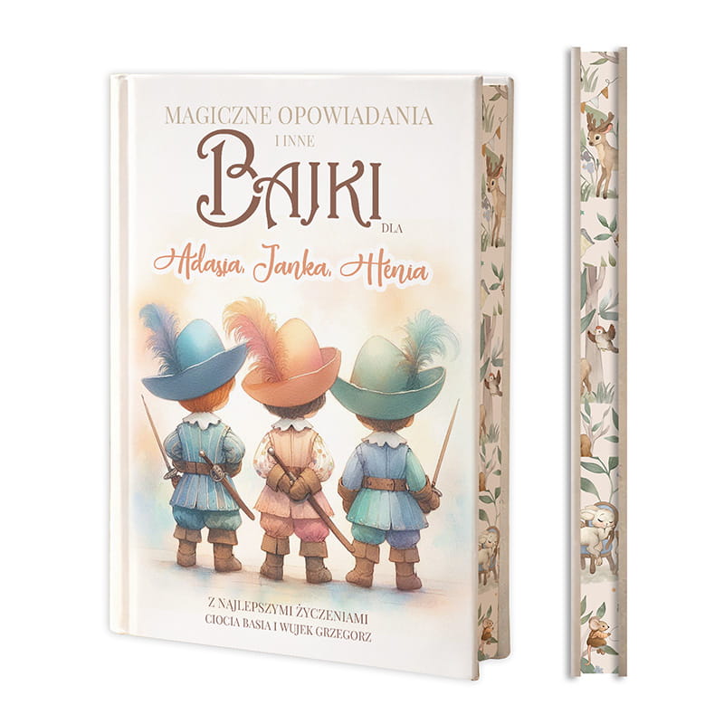 Okładka książki utrzymana jest w jasnej, subtelnej kolorystyce i przedstawia trzech małych muszkieterów stojących tyłem – każdy z nich ubrany jest w stylowy strój w pastelowych odcieniach niebieskiego, pomarańczowego oraz zielonego, z charakterystycznymi kapeluszami ozdobionymi piórami. Nad ilustracją widnieje tytuł „Magiczne opowiadania i inne bajki”, a poniżej znajdują się imiona dzieci – element ten podlega personalizacji. Na dole okładki znajduje się dedykacja z życzeniami oraz podpis, przy czym personalizacji podlega wyłącznie podpis. Wewnątrz książki znajduje się aż 40 bajek, a całość wyróżniają pięknie barwione, kolorowe brzegi kartek, które nadają publikacji elegancki i wyjątkowy wygląd.