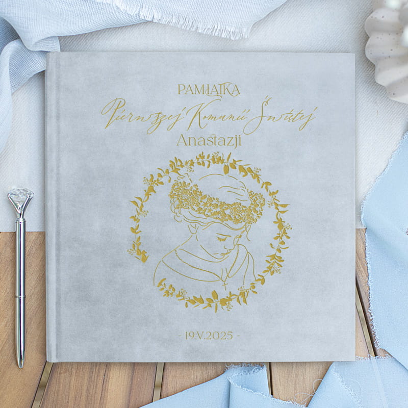 Personalizowana welurowa księga pamiątkowa na Komunię Świętą dla dziewczynki to elegancka pamiątka, która będzie towarzyszyć przez całe życie. Dzięki miękkiej, aksamitnej okładce księga zyskuje ekskluzywny wygląd, a personalizacja z imieniem dziecka oraz datą Komunii Świętej sprawia, że każdy egzemplarz jest jedyny w swoim rodzaju. To doskonały sposób, by zachować wspomnienia z Komunii Świętej w pięknej i trwałej formie.