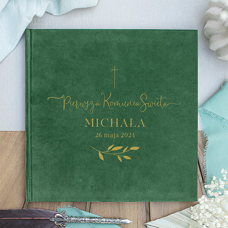 Personalizowany welurowy album na Komunię Świętą to ekskluzywna pamiątka na zdjęcia i wpisy, zachowująca wspomnienia na lata.