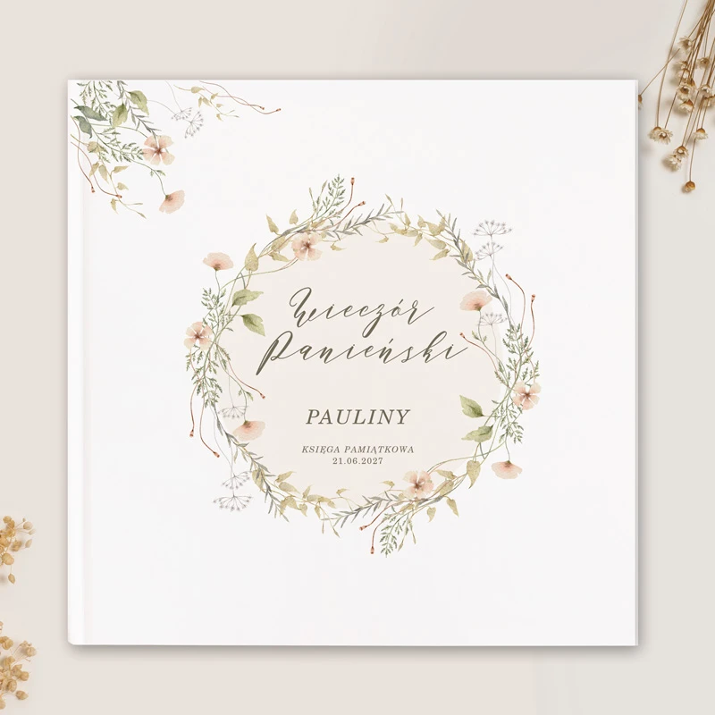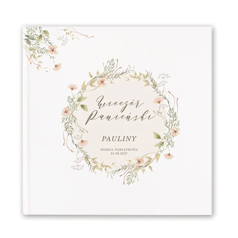 - Księga posiada elegancką, kremową, sztywną okładkę, którą zdobi stylowy nadruk utrzymany w klimacie boho. Na samym jej środku znajduje się motyw wianuszka z jasnych kwiatów oraz zielonych liści. Wzór ten widoczny jest również w lewej górnej części okładki. Wnętrze wianuszka ma kolor kremowy. Umieścimy tam napis: Wieczór Panieński + odmienione imię przyszłej Panny Młodej + Księga pamiątkowa + data Wieczoru Panieńskiego.