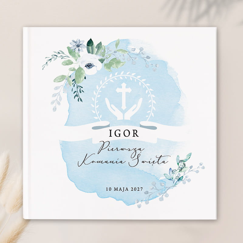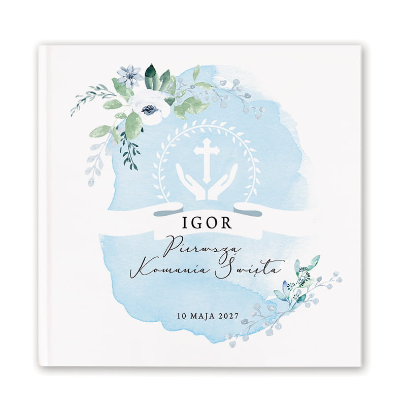 Personalizowana Księga Gości na Komunię Świętą z błękitnym akwarelowym motywem to piękna pamiątka na wpisy, życzenia i zdjęcia.